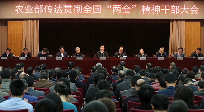 农业部党组副书记、副部长余欣荣主持会议。副部长张桃林传达了“两会”精神,副部长陈晓华宣读了《农业部关于表扬2016年度绩效管理优秀司局单位的通报》。在家部领导,中国农科院主要负责同志,近期退出部领导班子同志,离退休老部长,农业部全国人大代表、政协委员,部机关副处级以上干部,派出机构主要负责同志,在京直属单位领导班子成员,部机关离退休干部党支部书记等参加会议。